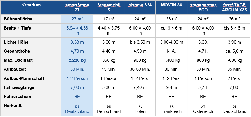 Das entscheidende Differenzierungsmerkmal im Kleinbühnen-Segment ist die Dachlast. Mit 2.220 kg Gesamtlast liegt die smartStage 27 im Direktvergleich ganz oben. Die Stagemobil S kommt auf lediglich 350 kg, die stagepartner ECO Stage auf 800 kg. Die alspaw S24 kommt auf insgesamt 1.480 kg freies Rigging.